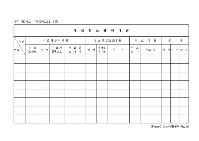 9,000원/월제13-3호 폐업 취소 관리 대장 (2000.12.6. 개정) 양식입니다. 사업자인적사항(상호, 성명, 사업자 등록번호, 사업장 소재지), 당초 폐업내용(일자, 휴폐업 구분, 사유), 취소내용(취소일자, 취소사유), 결재(담당, 주무, 과장) 등을 기재합니다.