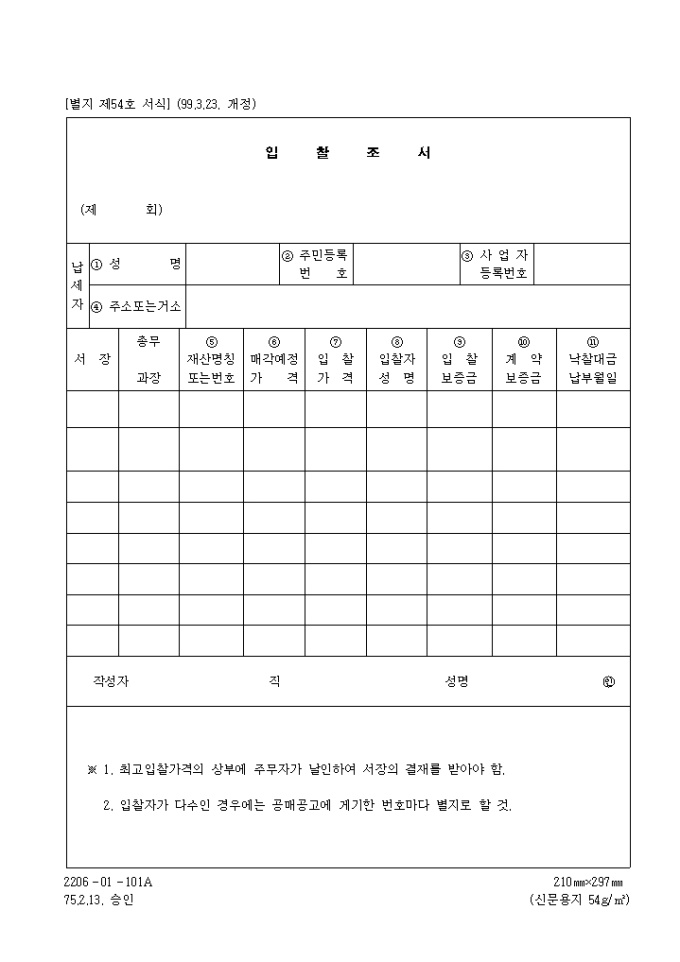 9,000원/월납세자 인적샂항,재산명칭또는번호,매각예정가격,입찰가격,입찰자 성명,입찰보증금,계약보증금,낙찰대금 납부월일을 기록하는 제54호 입찰조서입니다. (1999.3.23. 개정)