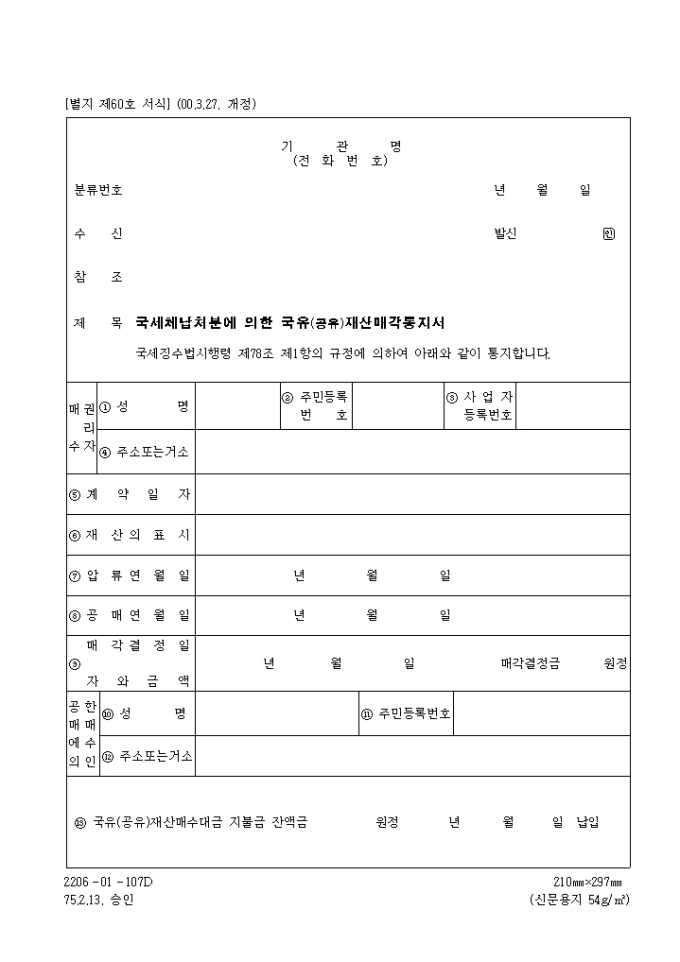 9,000원/월국세징수법시행령 제78조 제1항의 규정에 의하여 국세체납처분에 의한 국유재산매각을 통지할때 사용하는 제60호 국세체납처분에의한국유(공유)재산매각통지서입니다. (2000.3.27. 개정)