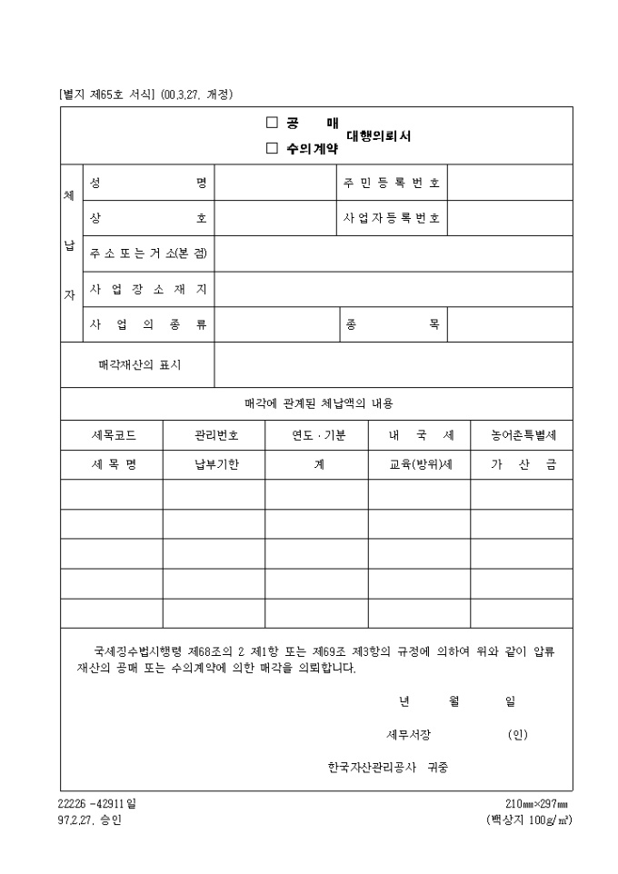 국세징수법시행령 제68조의 2 제1항 또는 제69조 제3항의 규정에 의하여 압류재산의 공매 또는 수의계약에 의한 매각을 의뢰할때 사용하는 제65호 공매(수의계약)대행의뢰서입니다. (2000.3.27. 개정)