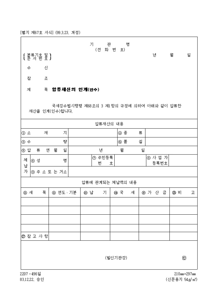 9,000원/월국세징수법시행령 제68조의 3 제1항의 규정에 의하여 압류한 재산을 인계(인수)를 할때 사용하는 제67호 압류재산의인계(인수) 입니다.(1999.3.23. 개정)