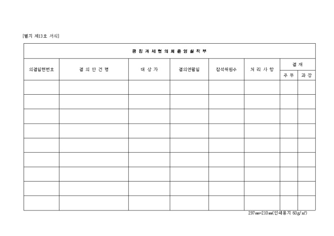 제13호 공정 과세 협의회 운영 실적부 양식입니다. 의결일련번호, 결의안건명, 대상자, 결의 연월일, 참석위원수, 처리사항, 결재 등을 기재합니다.