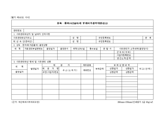 제143호 상속.증여(자금출처)세 부채사후관리대장 양식입니다. 사후관리 대상자 및 납세자 인적사항, 상속.증여세 결정상황, 사후관리 대상 명세 및 사후관리 상황, 사후관리 사항 등을 기재합니다.