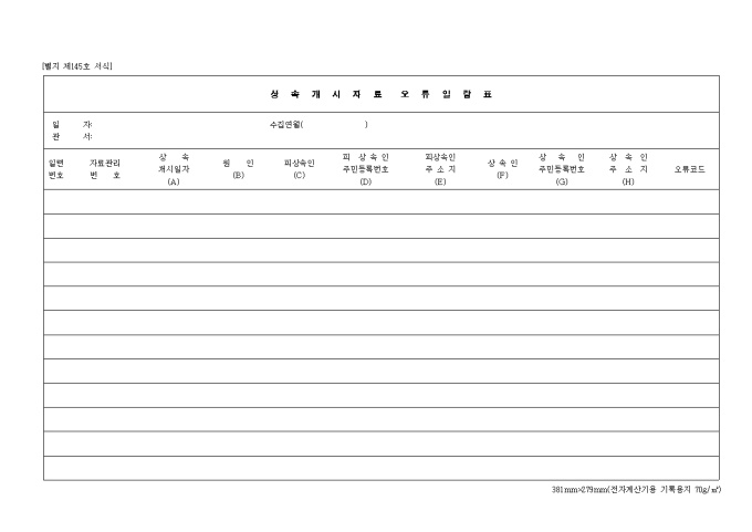 제145호 상속 개시 자료 오류 일람표 양식입니다. 일련번호, 자료관리 번호, 상속 개시일자, 원인, 피상속인, 피상속인 주민등록번호, 피상속인 주소지 등을 기재합니다.