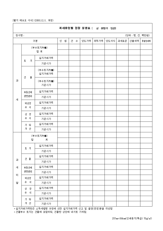 9,000원/월제14호 과세 유형별 결정 상황표(2000.12.11. 개정) 양식입니다. 구분에 따른 인원, 건수, 양도가액, 취득가액, 양도차익, 과세표준, 산출세액, 총결정세액 등을 기재합니다.