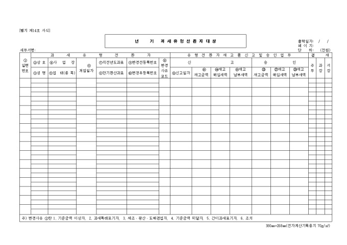 9,000원/월제14호 과세 유형전환자 대장 양식입니다. 일련번호, 상호, 성명, 사업장, 업태, 개업일자, 직전년도 과표, 만기환선과표, 변경전등록번호, 변경후 등록번호, 변경사유 코드, 신고일자, 재고금액 등을 기재합니다.