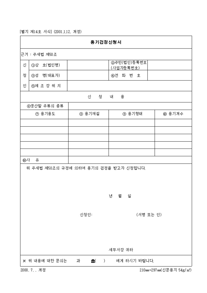 제14호 용기검정 신청서(2001.1.12. 개정) 양식입니다. 상호, 주민 등록번호, 전화번호, 제조장 위치, 신청내용 등을 기재합니다. 위 주세법 제50조의 규정에 의하여 용기의 검정을 받고자 신청합니다.