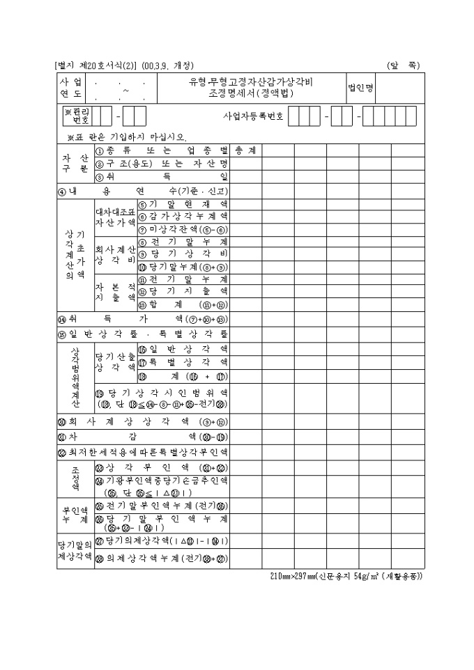 9,000원/월제20호(2) 유형.무형고정자산감가상각비종정명세서(정액법)로 자산구분,상각계산의 기초가액,취득가액,일반상각률,상각범위액계산,회사계상상각액,차감액,최저한세적용에따른 특별상각부인액,조정액,부인액 누계,당기말의제상각액을 기록합니다. (2000.3.9. 개정)