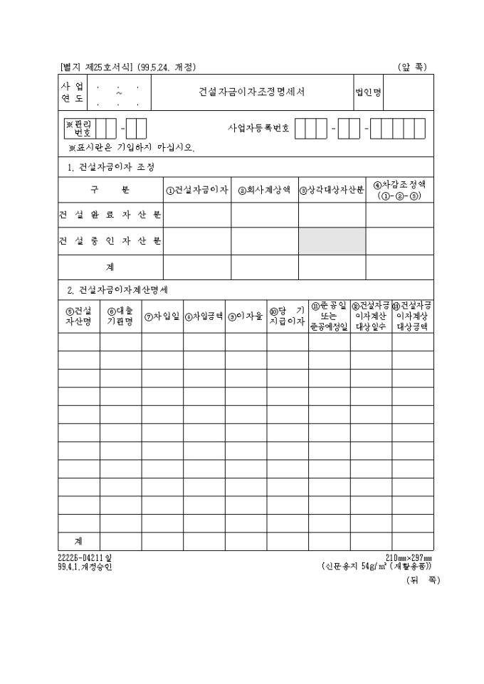 9,000원/월제25호 건설자금이자조정명세서로 건설자금이자 조정,건설자금이자계산명세를 기록합니다. (1999.5.24. 개정)