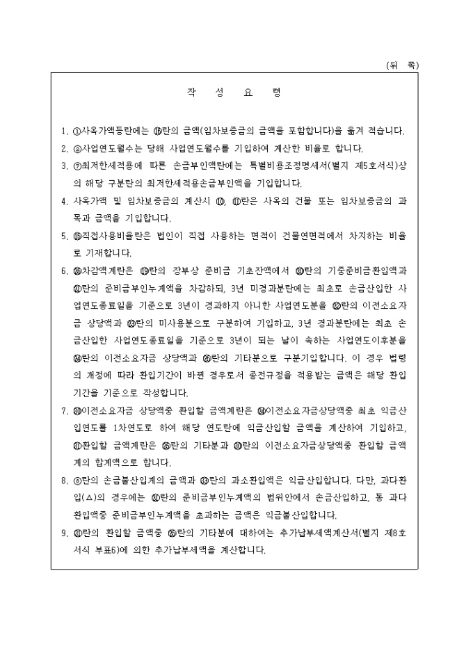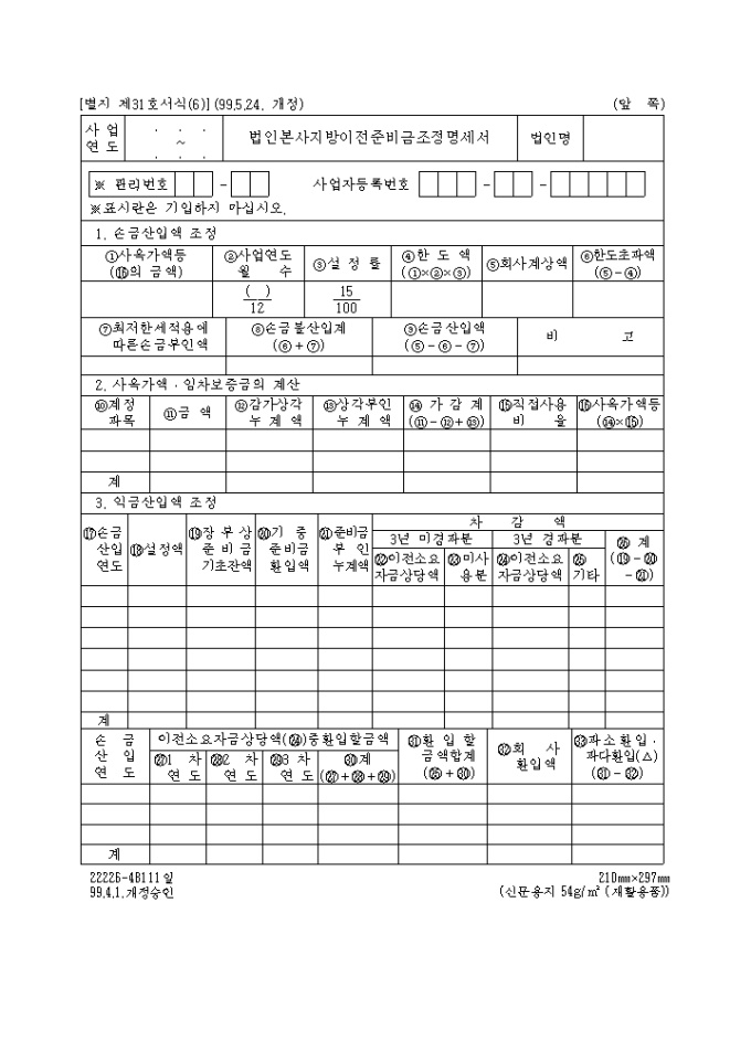 제31호(6) 법인본사지방이전준비금조정명세서로 손금산입액 조정,사옥가액․임차보증금의 계산,익금산입액 조정을 기록합니다. (1999.5.24. 개정)