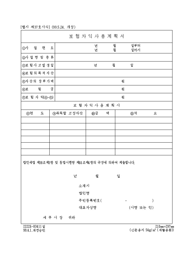 법인세법 제38조제3항 및 동법시행령 제66조제4항의 규정에 의하 보험차익사용계획서입니다.