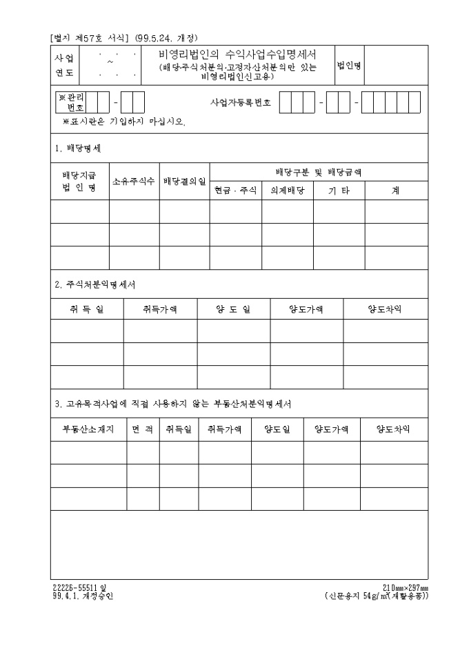 제57호 비영리법인의수익사업수입명세서(배당.주식처분익.고정자산처분익만있는비영리법인신고용)로 배당명세,주식처분익명세서,고유목적사업에 직접 사용하지 않는 부동산처분익명세서로 구성되어 있습니다. (1999.5.24. 개정)