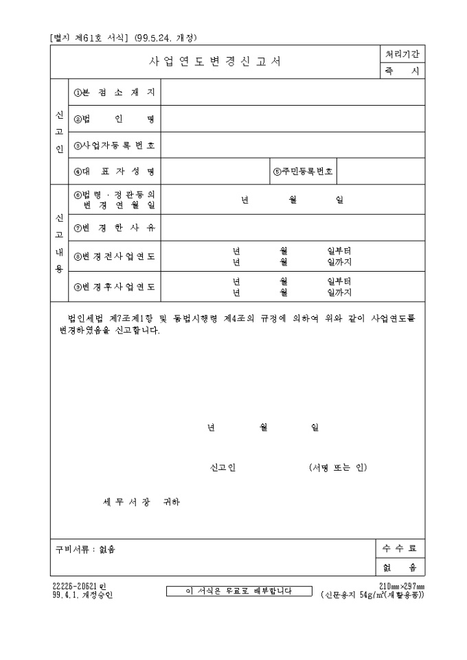 사업년도변경신고서(제61호)(1999.5.24. 개정)