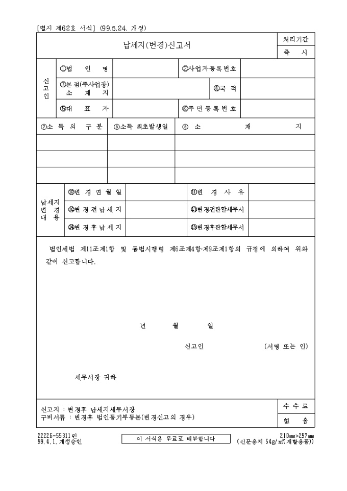 법인세법 제11조제1항 및 동법시행령 제6조제4항․제9조제1항의 규정에 의하여 납세지 (변경)신고할때 사용하는 양식입니다.