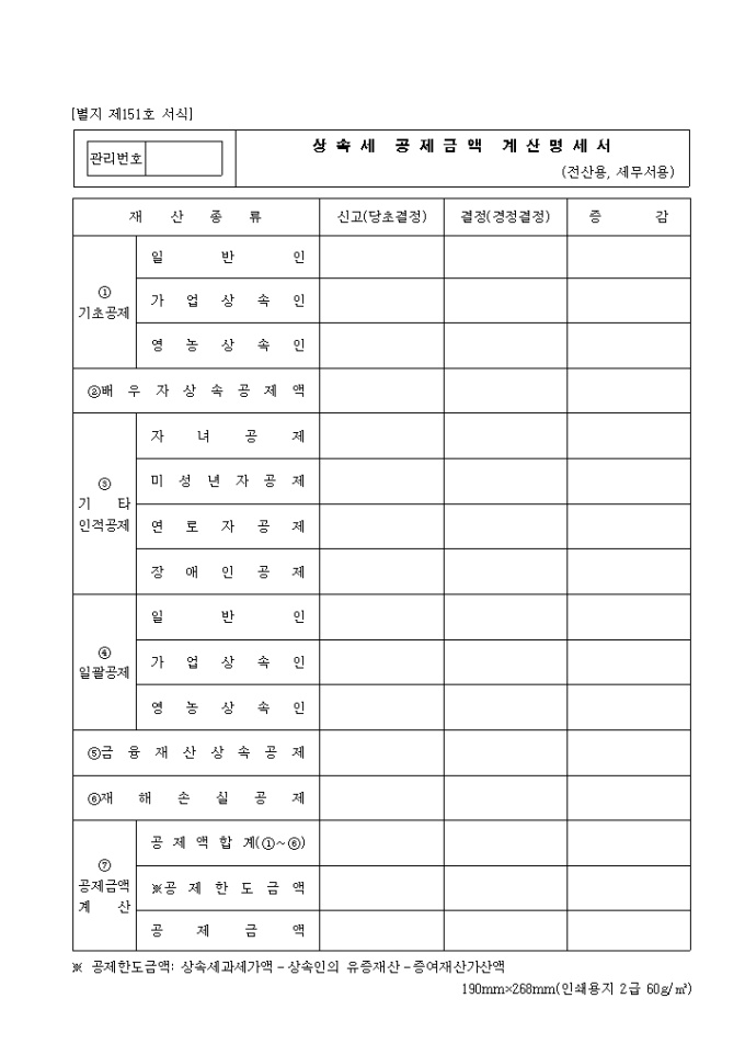 9,000원/월제151호 상속세 공제금액계산 명세서 양식입니다. 기초공제, 배우자 상속공제액, 기타 인적공제, 일괄공제, 금융 재산 상속공제, 재해손실공제, 공제 금액 계산 등을 기재합니다.