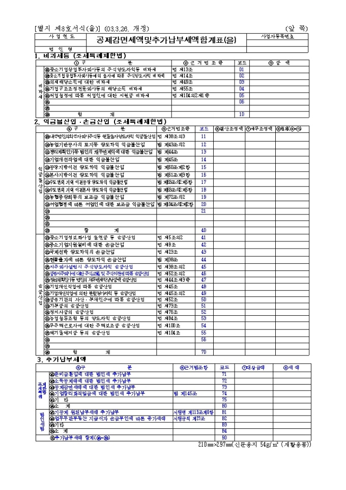 9,000원/월제8호(을) 공제감면세액및추가납부세액합계표(을)로 비과세등,의금불산입.손금산업,추가납부세액을 기록합니다. (2003.3.26. 개정)