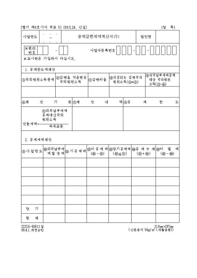 제8호부표5 공제감면세액계산서(5)로 공제한도액계산,공제세액계산을 기록합니다. (1999.5.24. 신설)