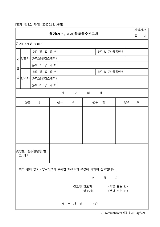 9,000원/월제15호 용기(기구, 기계)양도양수신고서(2000.2.18. 개정)