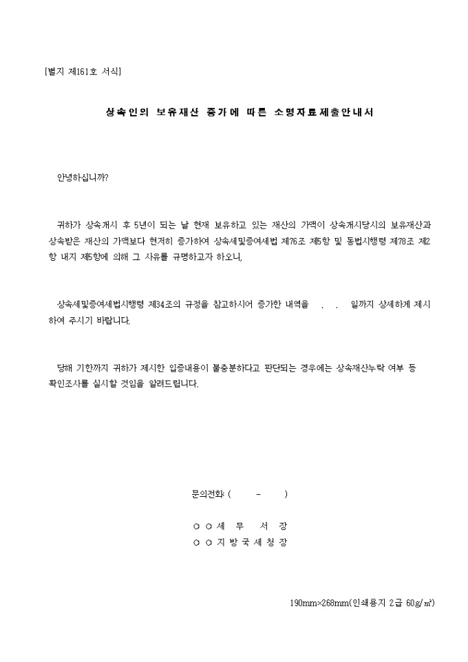 귀하가 상속개시 후 5년이 되는 날 현재 보유하고 있는 재산의 가액이 상속개시당시의 보유재산과 상속받은 재산의 가액보다 현저히 증가하여 상속세및증여세법 제76조 제5항 및 동법시행령 제78조 제2항 내지 제5항에 의해 그 사유를 규명하고자 하오니,