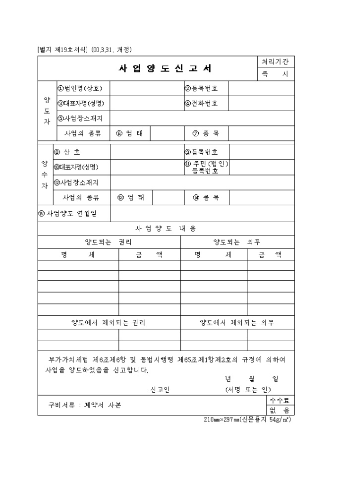 부가가치세법 제6조제6항 및 동법시행령 제65조제1항제2호의 규정에 의하여 사업을 양도하였음을 신고할때 사용하는 제19호 사업양도신고서입니다. (2000.3.31. 개정)