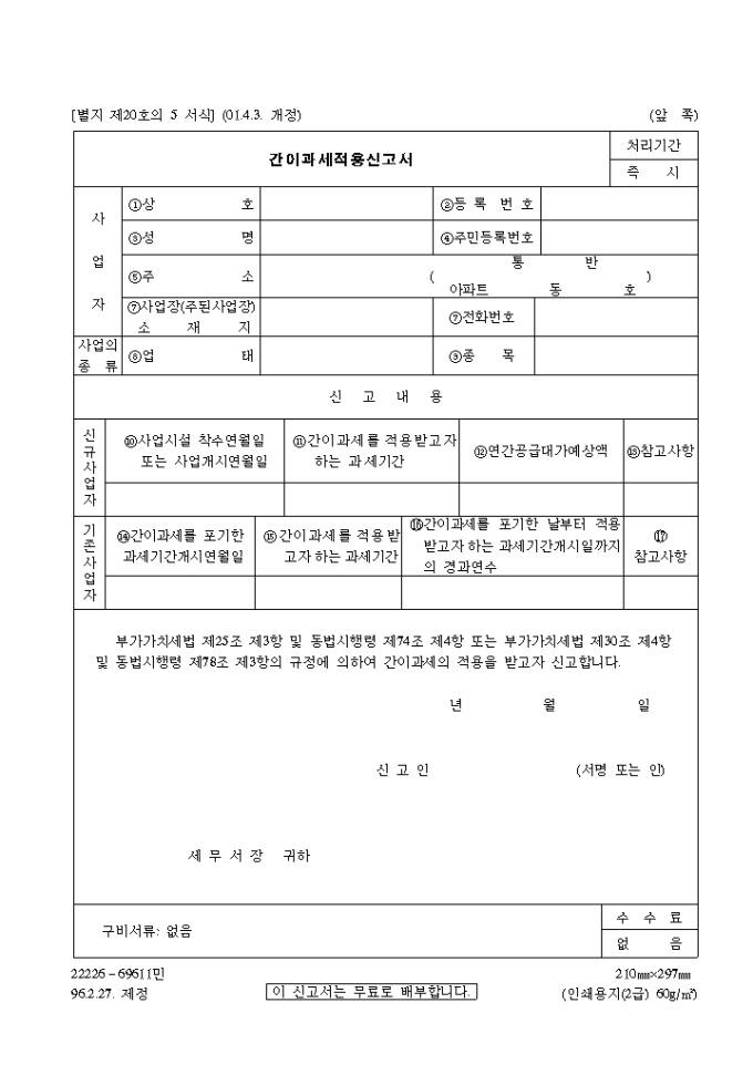 9,000원/월부가가치세법 제25조 제3항 및 동법시행령 제74조 제4항 또는 부가가치세법 제30조 제4항 및 동법시행령 제78조 제3항의 규정에 의하여 간이과세의 적용을 받고자 신고할때 사용하는 양식입니다.
