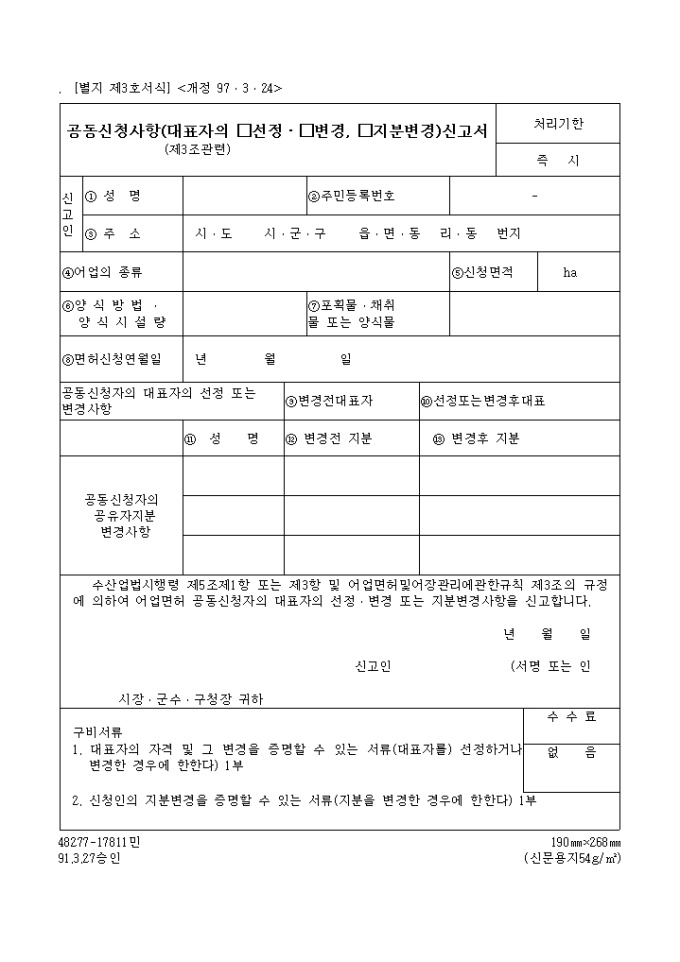 9,000원/월수산업법시행령 제5조제1항 또는 제3항 및 어업면허및어장관리에관한규칙 제3조의 규정에 의하여 어업면허 공동신청자의 대표자의 선정․변경 또는 지분변경사항을 신고하고자 할 때 사용하는 "공동 신청 사항 (대표자의 선정,변경,지분변경) 신고서 (제3조관련)" 양식입니다.