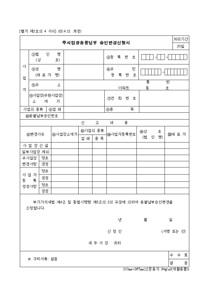 9,000원/월부가가치세법 제4조 및 동법시행령 제5조의 2의 규정에 의하여 총괄납부승인변경을 신청할때 사용합니다.