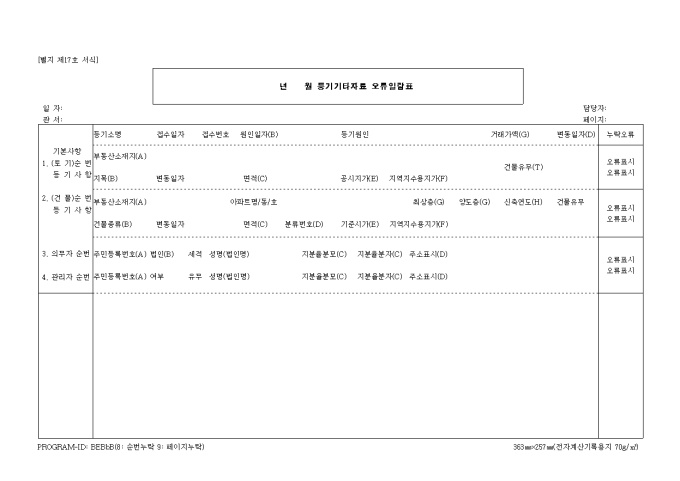 9,000원/월제17호 등기기타자료 오류일람표 기본사항 양식입니다. 1. (토 기)순번 등기사항 2. (건 물)순 번 등기사항 3. 의무자 순번 4. 관리자 순번