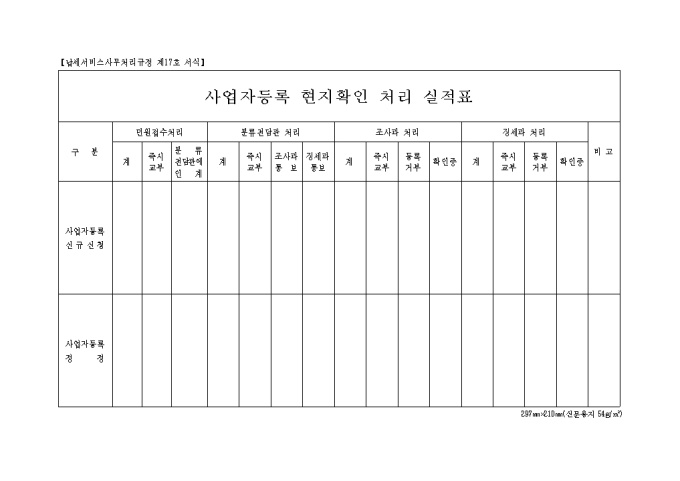 9,000원/월제17호 사업자 등록 현지 확인 처리 실적표 양식입니다. 구분에 따른 민원접수처리, 분류전담관 처리, 조사과 처리, 징세과 처리, 비고 등을 기재합니다.