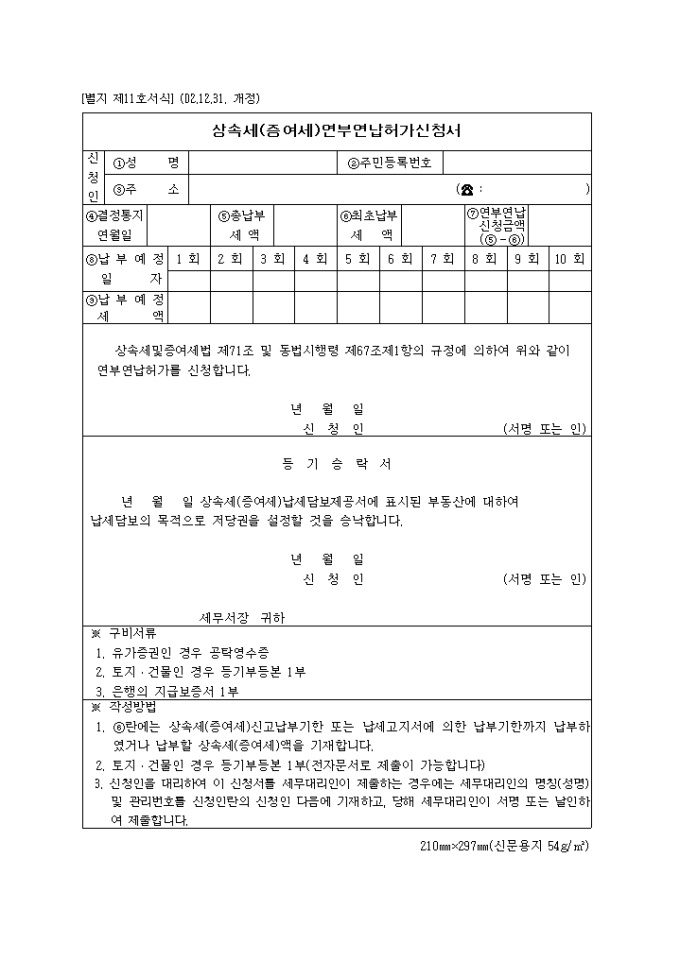 9,000원/월상속세및증여세법 제71조 및 동법시행령 제67조제1항의 규정에 의한 제11호 상속세(증여세)연부연납허가신청서입니다. (2002.12.31. 개정)