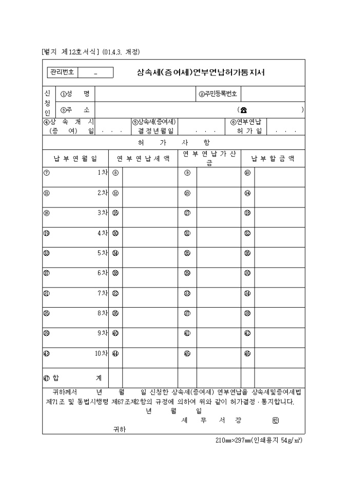 9,000원/월상속세및증여세법 제71조 및 동법시행령 제67조제2항의 규정에 의한 제12호 상속세(증여세)연부연납허가통지서입니다. (2001.4.3. 개정)