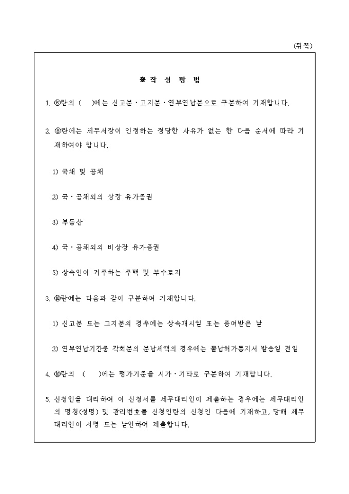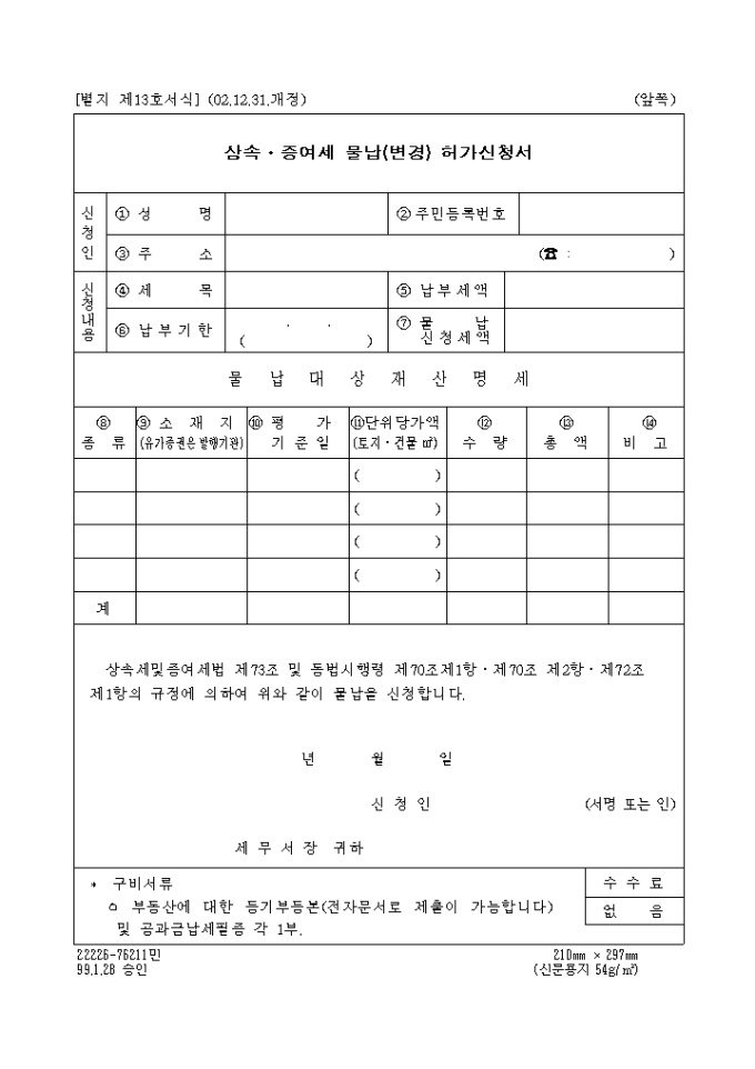 9,000원/월상속세 및 증여세법 제73조 및 동법시행령 제70조제1항·제70조 제2항·제72조 제1항의 규정에 의한 제13호 상속.증여세물납(변경)허가신청서입니다.(2002.12.31.개정)