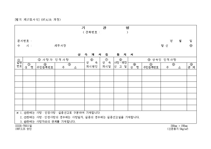 9,000원/월사망자 인적사항,상속개시원인,상속개시일,사망.매장신고일,상속인 인적사항을 기록하는 제17호 상속개시등통지서입니다. (1997.4.19. 개정)