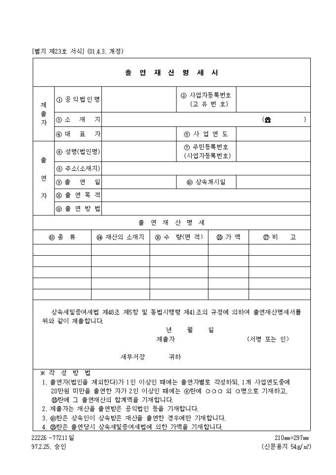 9,000원/월상속세및증여세법 제48조 제5항 및 동법시행령 제41조의 규정에 의한 제23호 출연재산명세서입니다. (2001.4.3. 개정)