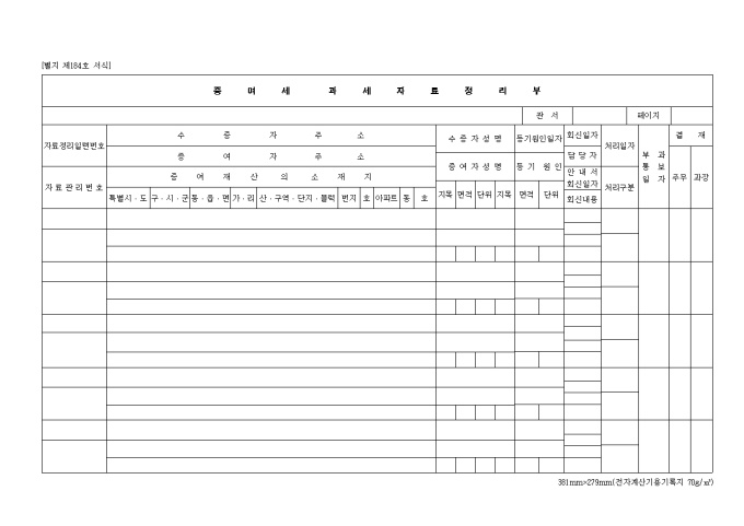 9,000원/월수증자주소, 증여자주소, 증여재산의 소재지, 수증자성명, 증여자성명, 등기원인일자, 회신일자 등을 기록하여 정리하는 제184호 증여세 과세자료정리부 양식입니다.