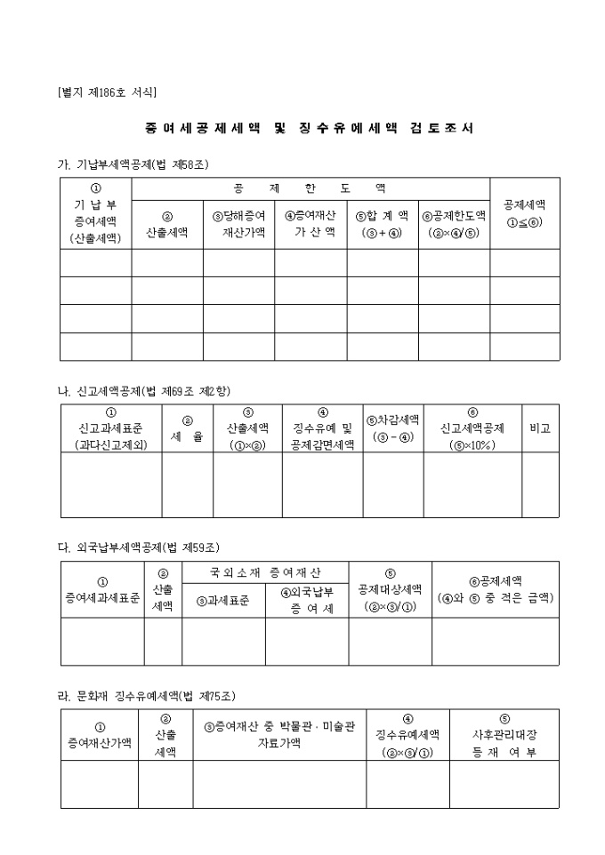 제186호 증여세공제세액 및 징수유예세액검토조서 양식입니다.