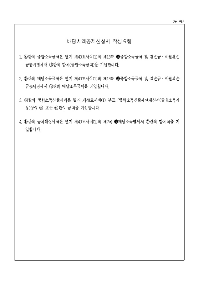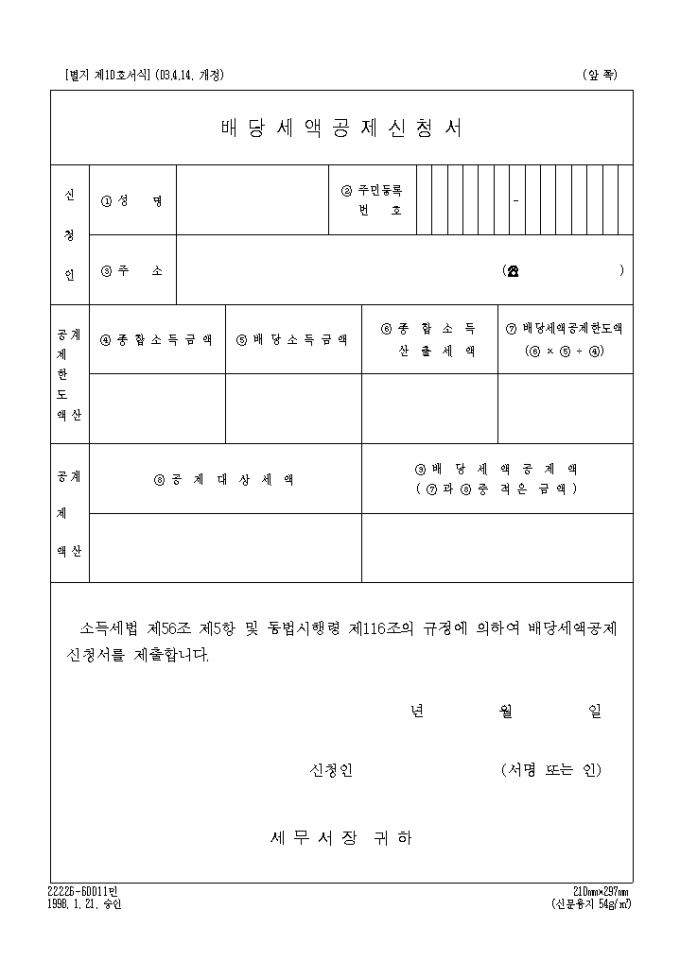 9,000원/월별지 제10호 배당세액공제신청서로 신청인 인적사항,공제한도액,공제액을 기록합니다. (2003.4.14. 개정)