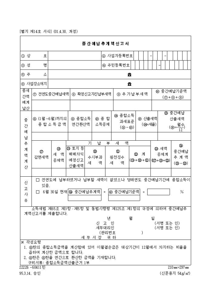 제14호 중간예납추계액신고서(2001.4.30. 개정)