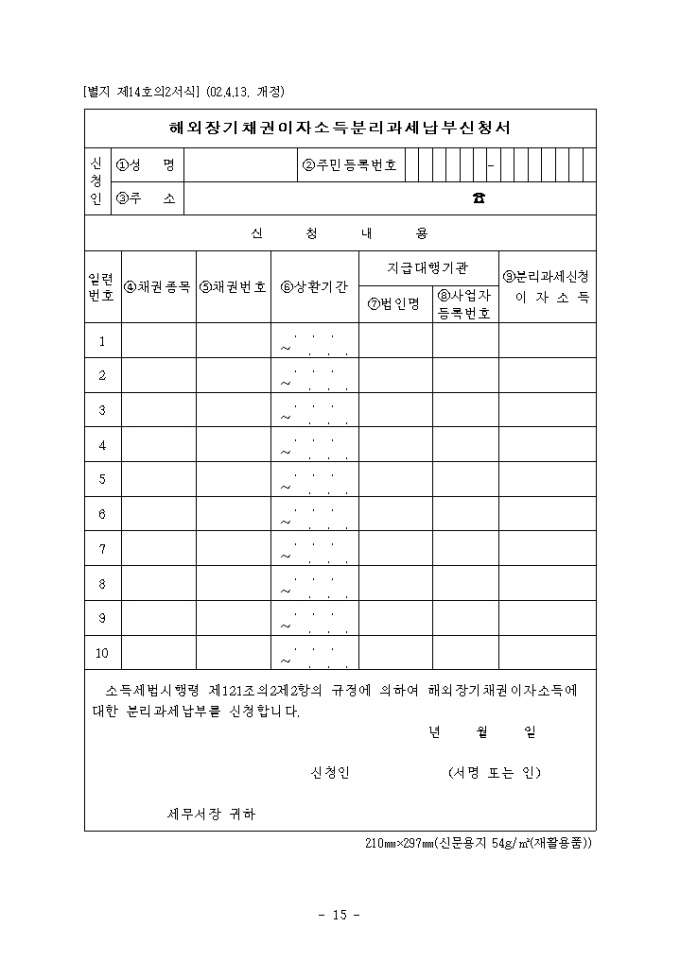 9,000원/월별지 제14호의2 해외장기채권이자소득분리과세납부신청서로 신청인 인적사항,채권종목,채권번호,상황기간,지급대행기관,분리과세신청 이자소득을 기록합니다. (2002.4.13. 개정)