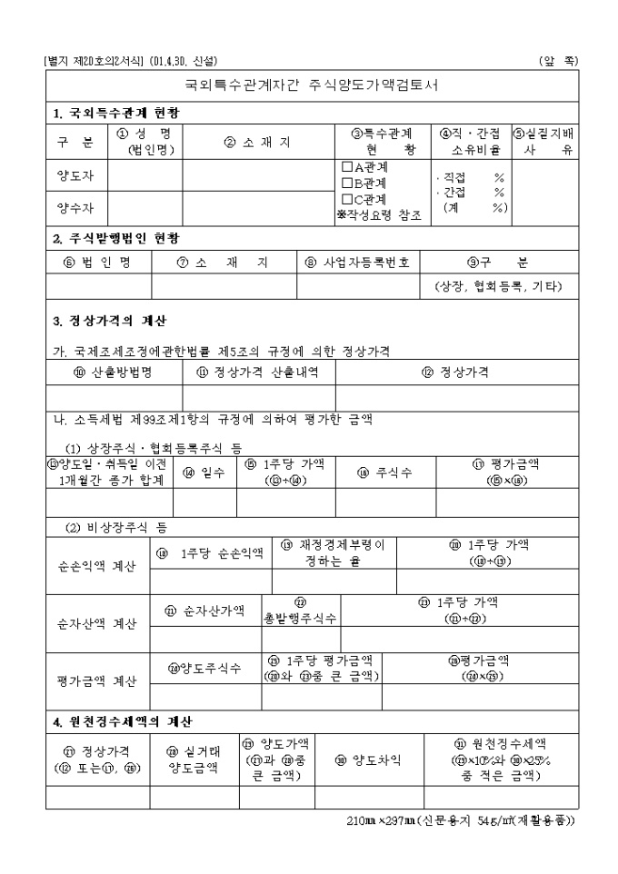 9,000원/월별지 제20호의2 국외특수관계자간주식양도가액검토서로 국외특수관계 현황,주식발행법인 현황,정상가격의 계산,원천징수세액의 계산을 기록합니다. (2001.4.30. 신설)