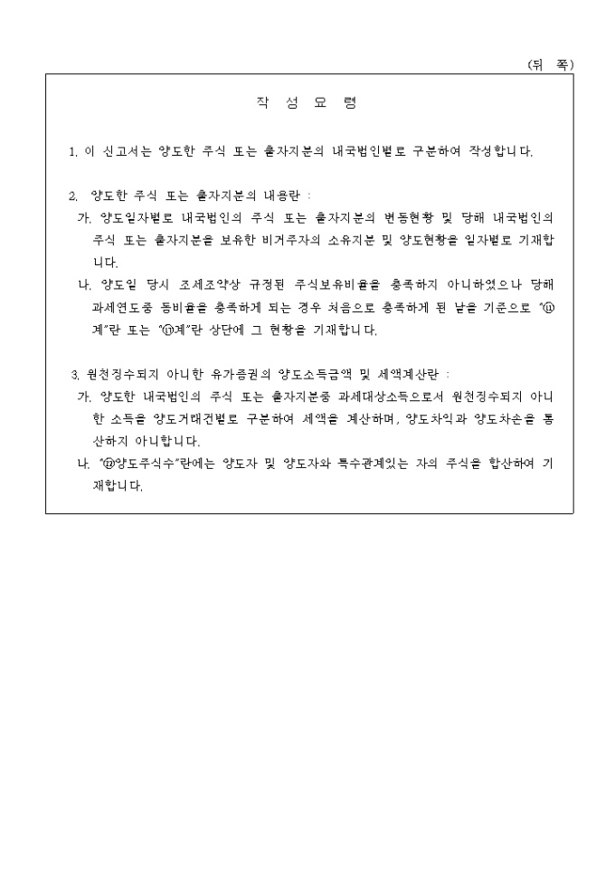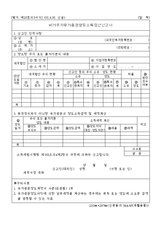 소득세법시행령 제183조의4제2항의 규정에 의하여 비거주자 유가증권 양도소득 정산신고할때 사용하는 양식입니다. (2001.4.30. 신설)