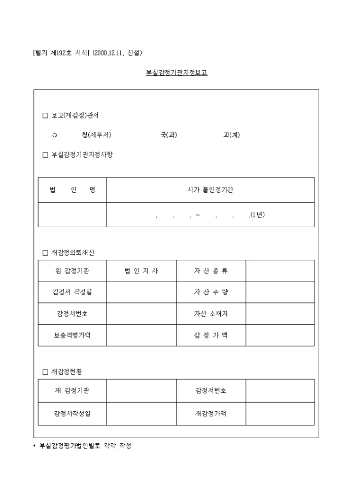 제192호 부실 감정 기관지정보고(2000.12.11. 신설) 양식입니다. 부실감정기관 지정사항, 재감정 의뢰 재산, 재감정 현황 등을 기재합니다.