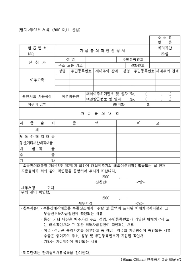 9,000원/월제193호 자금 출처 확인 신청서(2000.12.11. 신설) 양식입니다. 신청자, 이주가족, 확인서의 사용목적, 이주비 금액, 자금출처내역 등을 기재합니다.