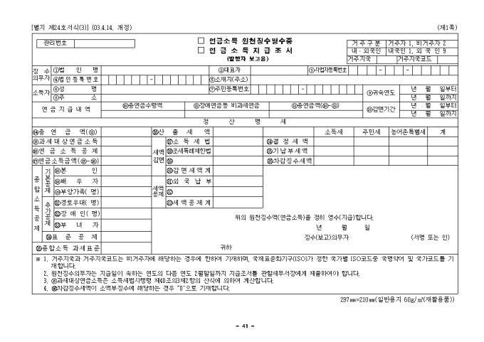 9,000원/월별지 제24호(3) 연금소득원천징수영수증,연금소득지급조서로 원천징수액(연금소득)을 정히 영수(지급)할때 사용합니다. (2003.4.14. 개정)