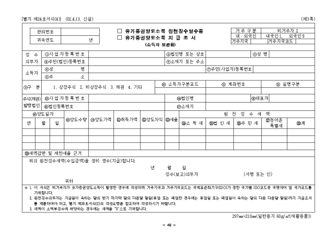 유가증권양도소득원천징수영수증, 유가증권양도소득지급조서(제24호(4))(2002.4.13. 신설)