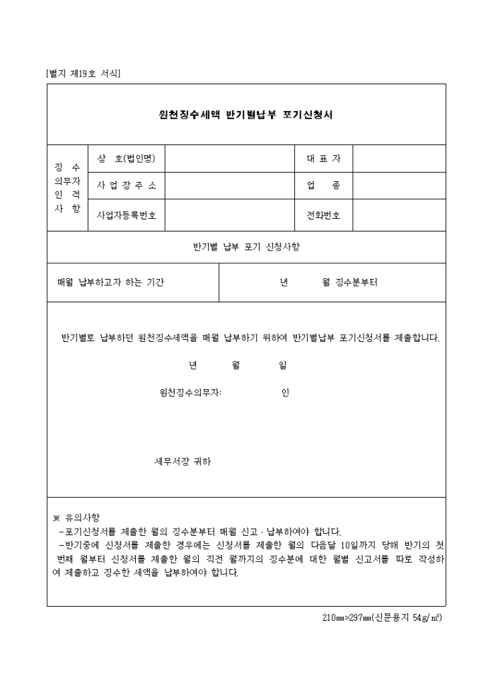 9,000원/월제19호 원천징수세액 반기별납부포기신청서