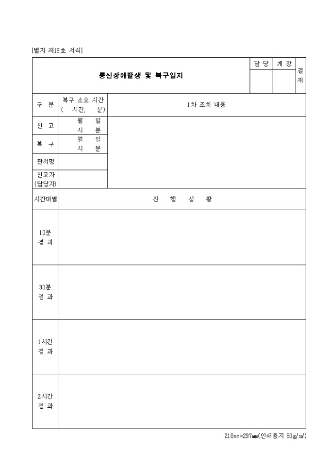 9,000원/월1차 조치내용, 복구소요시간, 시간대별 진행사항 등을 기록하는 제19호 통신장애발생 및 복구일지 양식입니다.