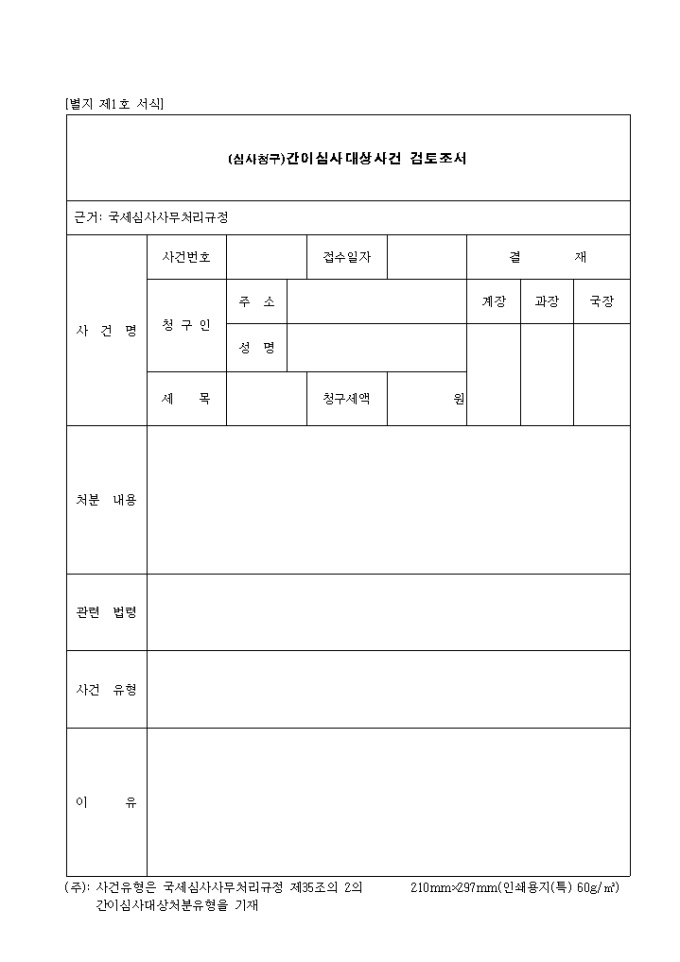 제1호 (심사청구)간이심사대상 사건 검토조서 양식입니다. 사건명, 처분내용, 관련 법렬, 사건 유형, 이유 등을 기재합니다.