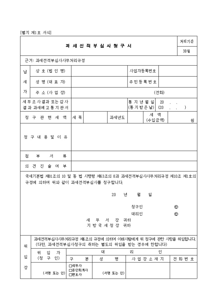 과세 전적부 심사사무처리 규정 제6조의 규정에 의하여 아래사람에게 위 청구에 관한 사항을 위임합니다. (다만, 과세전적부심사청구의 취하는 별도의 위임을 받는 경우에 한합니다)