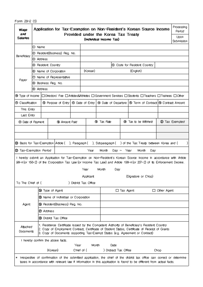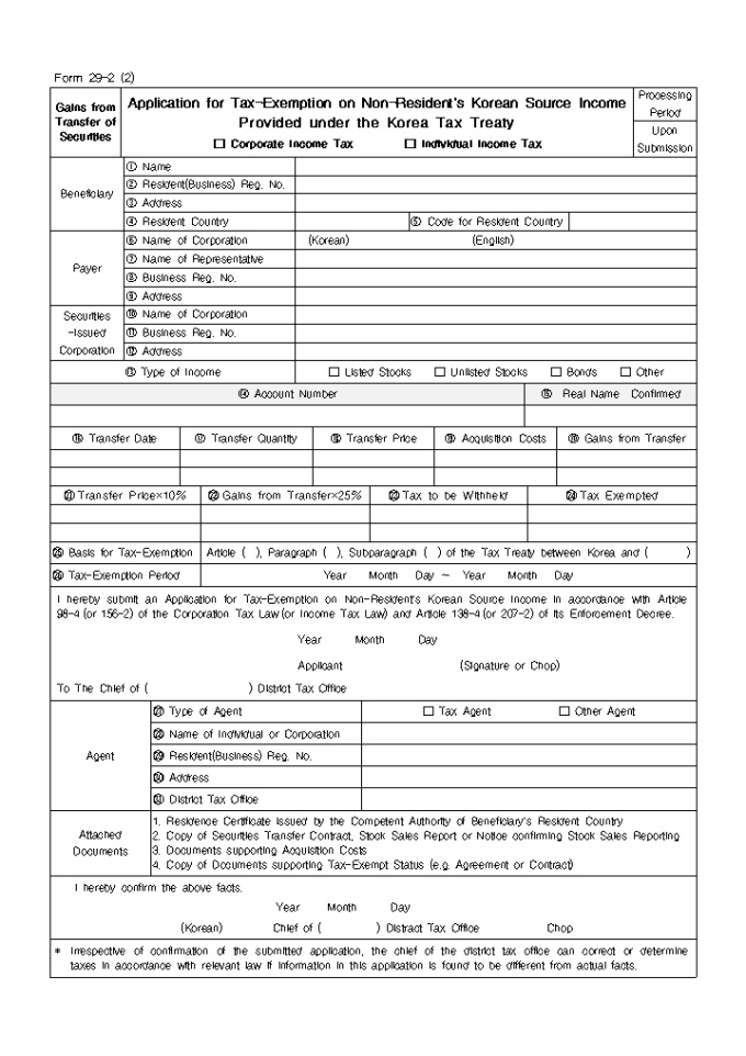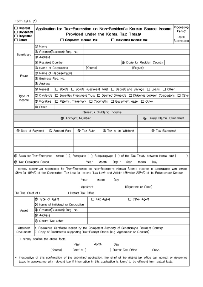 별지 제29호의2 비과세 면제신청서로 영문으로 되어 있습니다.